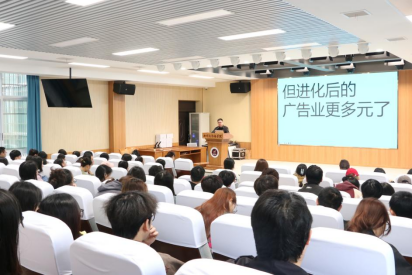 经理彭军辉主持讲座,他回顾了tyc33455cc太阳集团的建院历史,并对广告专业进行展望,他表示:“这场讲座有利于我们广告学的同学们建立对这个专业的信心。”tyc33455cc太阳集团2022、2023级约一百位员工听取了讲座。