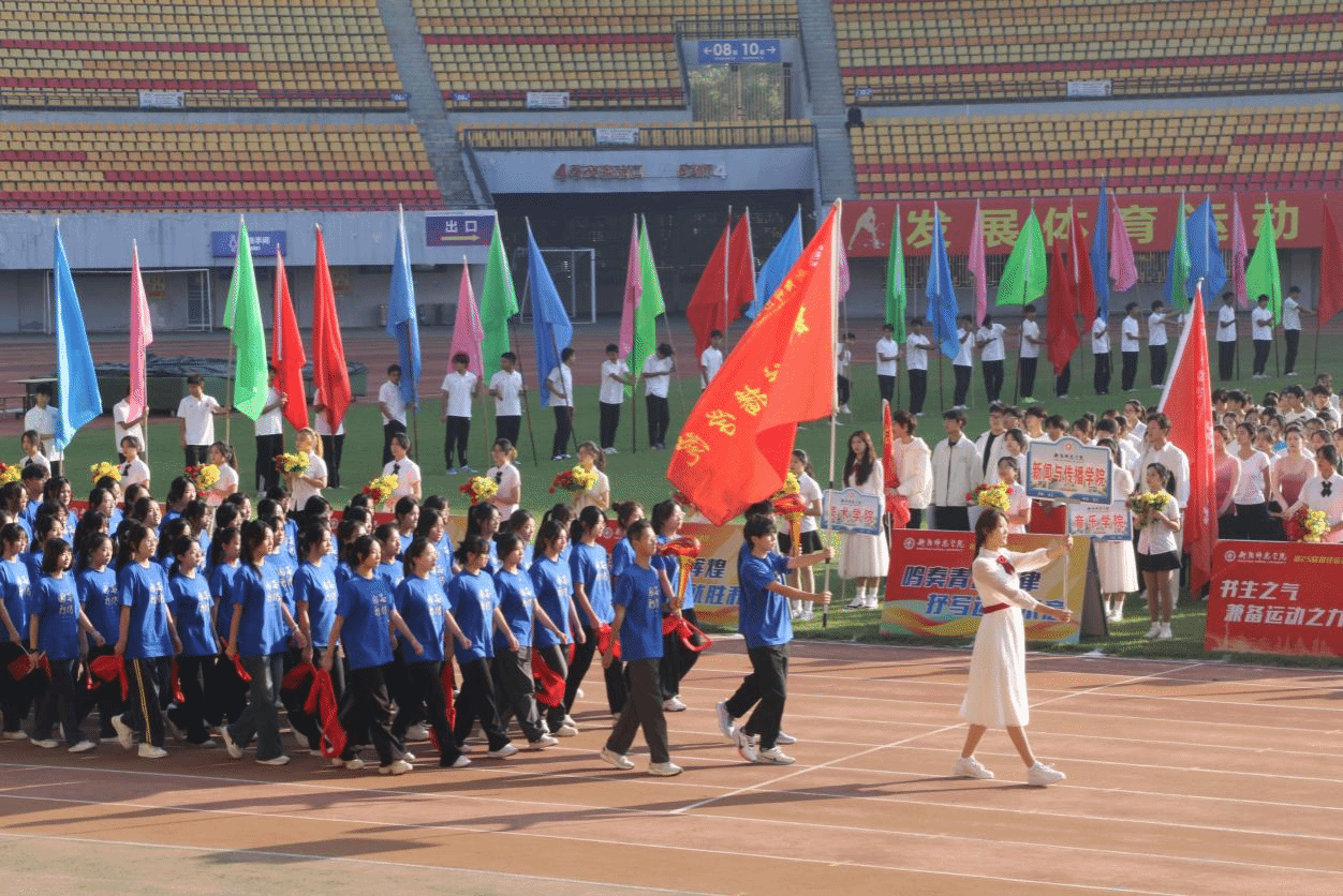 挥旗举标,昂首步入田径场