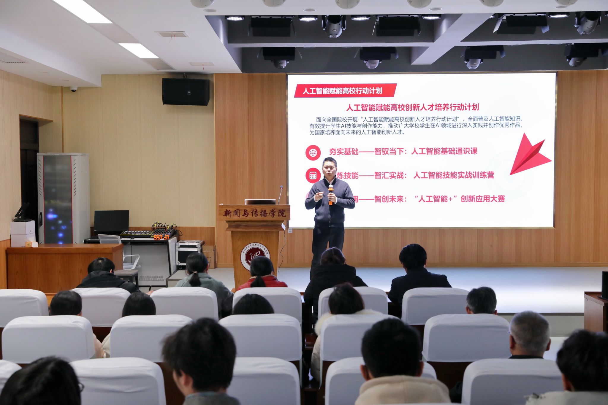 彭军辉经理主持讲座,他指出,当前科技发展日新月异,人工智能的浪潮正席卷各个行业,新闻传播领域也深受其影响,正经历着前所未有的变革。我们身处这样的时代,既是机遇也是挑战。新闻传播行业对人才的要求越来越高,不仅要具备扎实的专业基础,更要紧跟时代步伐,掌握前沿技术。