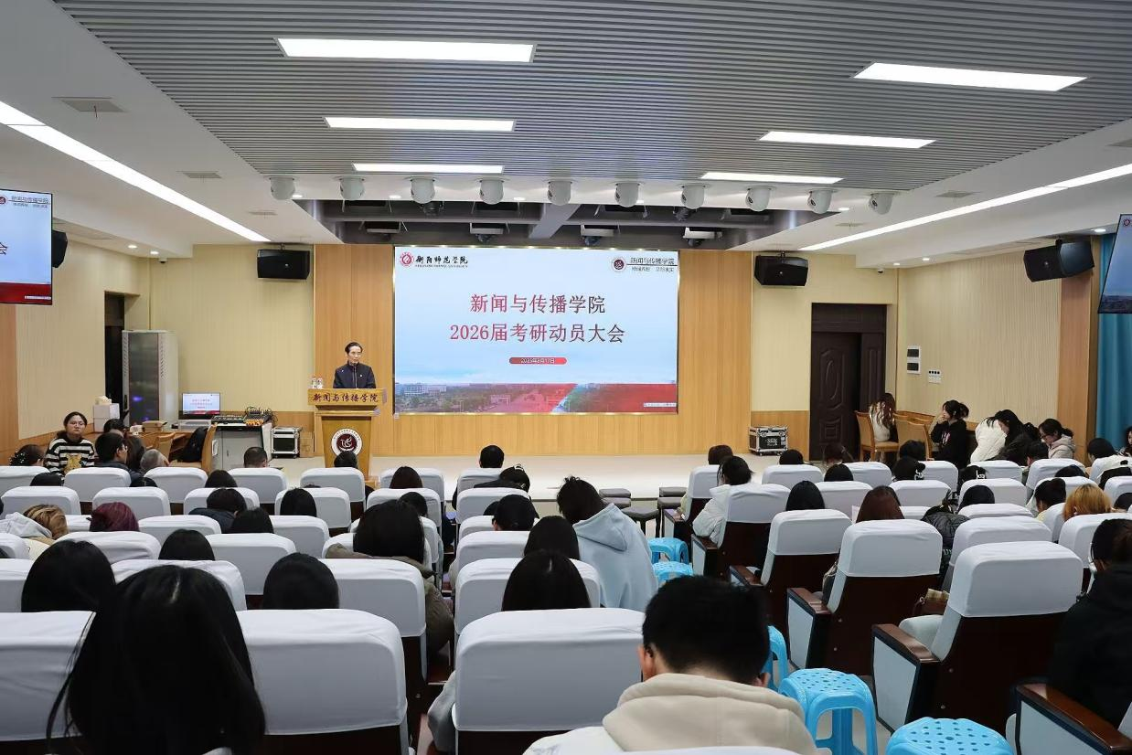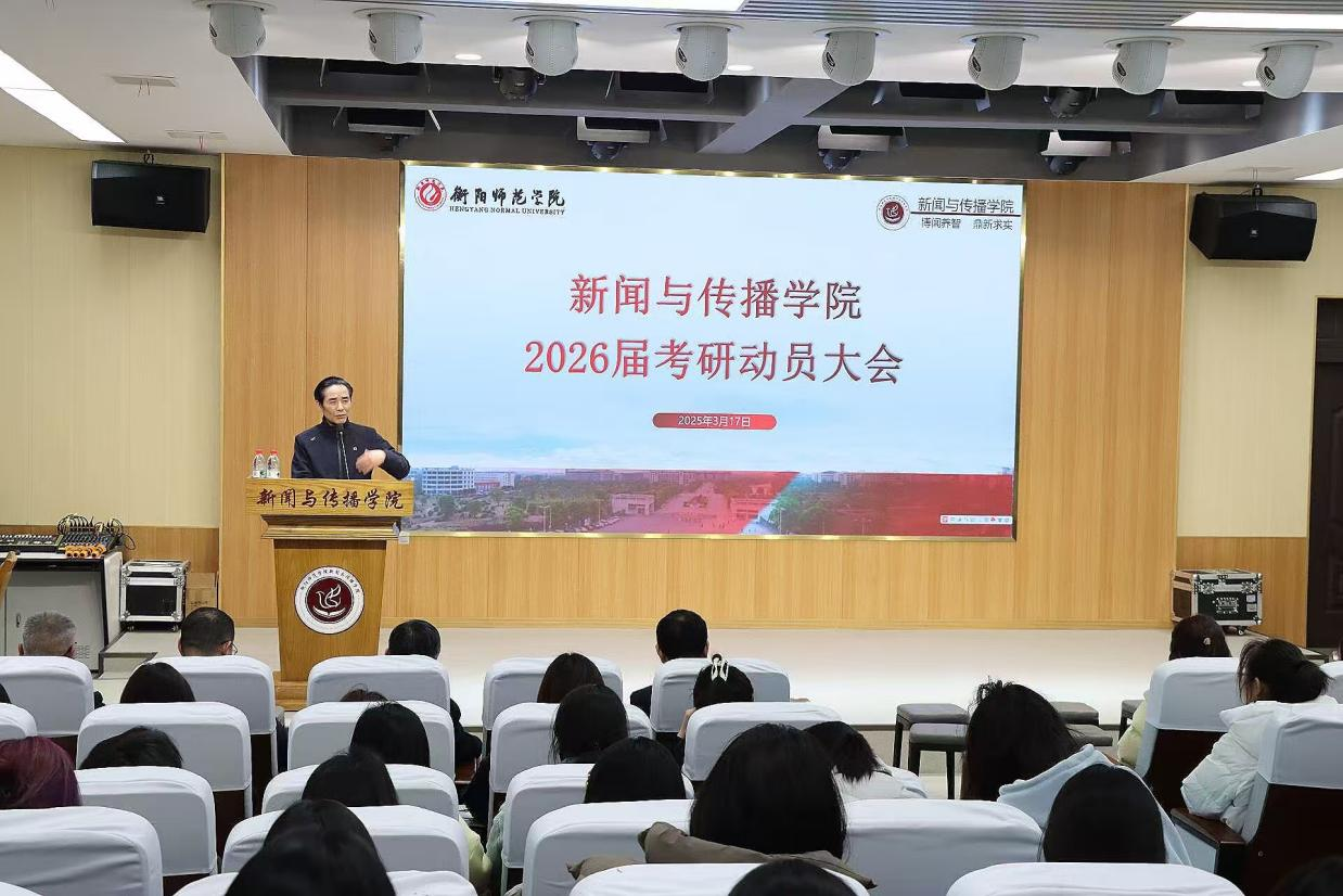 3月17日,tyc33455cc太阳集团于文科楼一楼演播厅召开了2026届考研动员大会。新闻与传播公司党总支书记彭晖、经理彭军辉、党总支副书记董自雄、副经理邓庄、副经理罗兵、学工办副主任兼团委书记封伟为、辅导员刘国杰、海文考研机构董事长国玉明、研究生陈婧娜以及22级全体同学参加此次会议。