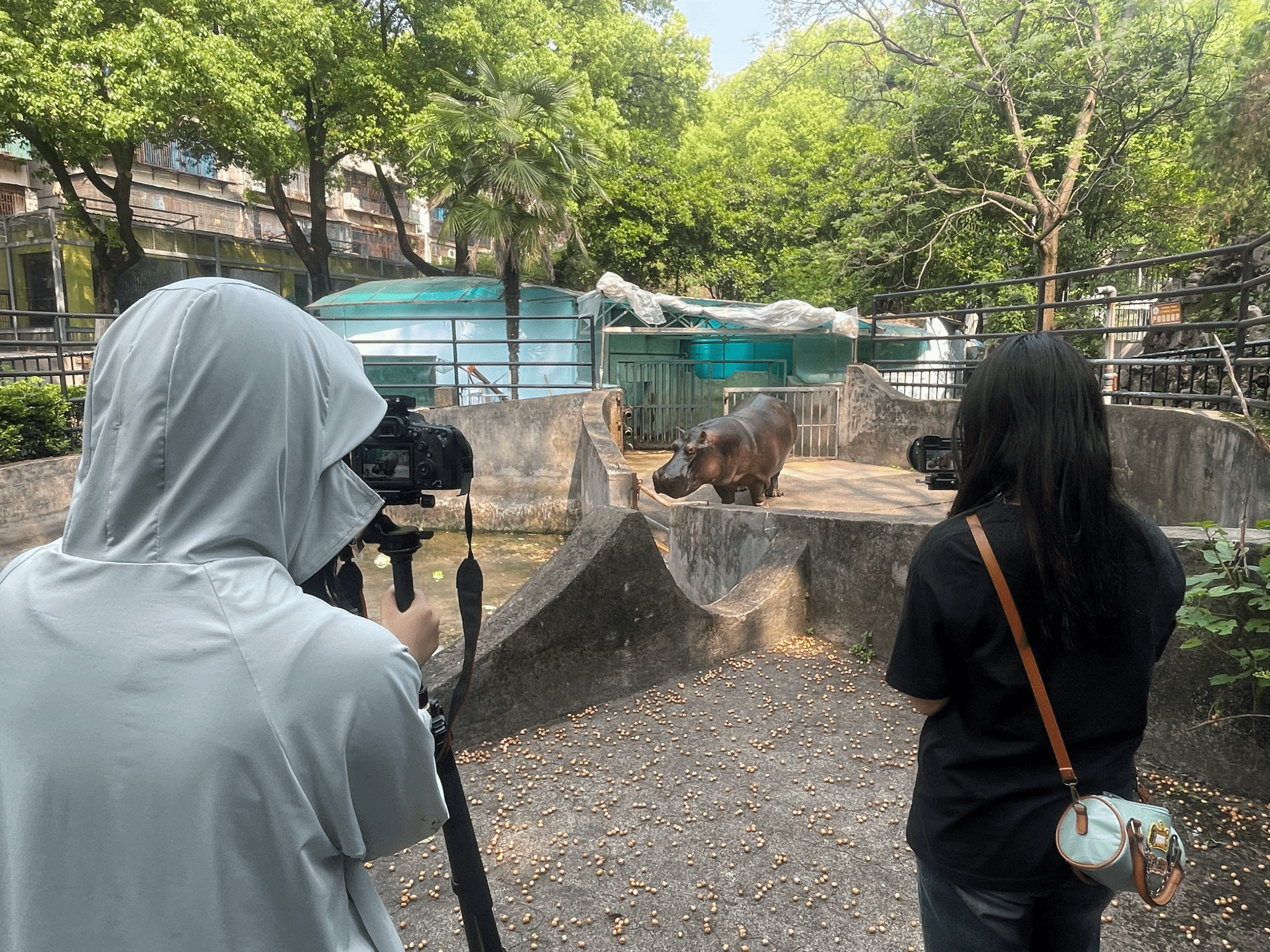 对于留在衡阳的见习小组来说,今天是难得一遇的好天气。经过前期的几次踩点和拍摄,周汇宇小组的某一小分队今天顺利的采访到了衡阳动物园有关的工作人员,来了一次与动物的“亲密接触”。与隔着铁笼观看动物的感受不同,走到园区里才发现,那些看起来威风凛凛的“猛兽”其实也是一群胆小鬼,例如张着“血盆大口”的河马,嘴巴里其实嚼的是青菜;比饲养员还高壮的马鹿,在看见三脚架上面“黑玩意”后吓得在角落瑟瑟发抖。