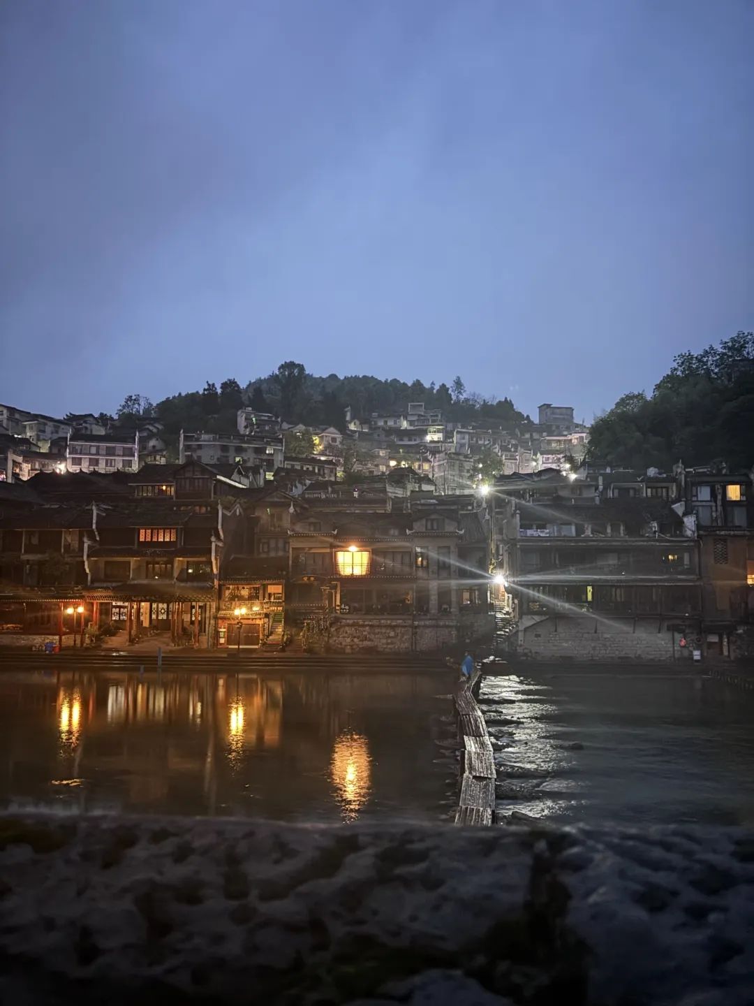 漫步于凤凰街巷,一只小狗在青石板上慵懒晒着太阳,成员们驻足逗弄,镜头里小家伙眺望远方的模样,恰是古城惬意生活的生动剪影。沱江水面泛起温柔涟漪,吊脚楼倒影随波晃动。小组成员们举着手机定格每一帧风景,亦捕捉到彼此眼中闪烁的灵感。夜幕降临时,古城灯火渐次点亮,各小组的实践记录仍在继续。