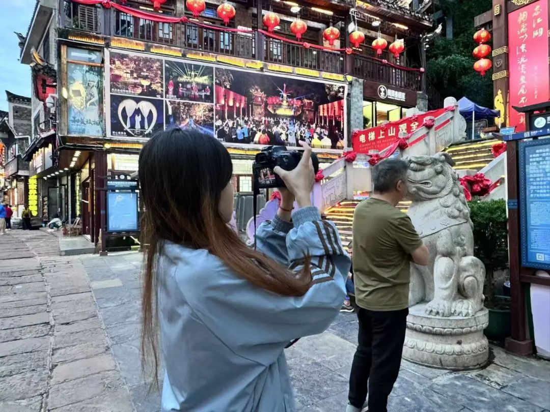 清晨,我们与苗鼓队相约从文广场。表演者的鼓点如心跳般明快,步法与鼓韵相得益彰,成员们在体验敲击苗鼓的过程中,感受非遗文化的生命力。午后采景时,团队捕捉到湘西特有的峰峦与梯田光影。晚间观看《烟雨凤凰》演出,舞台上的山水实景与民俗叙事,为实践记录增添了立体的文化注脚。