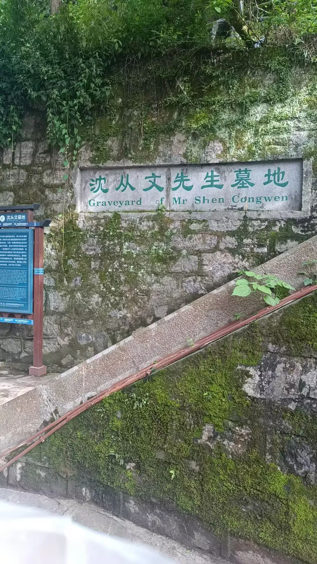 沿沱江而行的一支队伍抵达沈从文墓地。先生的骨灰一半洒入沱江,一半眠于山林。石碑正面写着:照我思索,能理解“我”;照我思索,可认识“人”。背面铭文写着:不折不从,亦慈亦让,星斗其文,赤予其人。凤凰古城成为旅游胜地以来,各地人们都前来打卡拍照。走在凤凰街头,各式各样的吆喝声扑面而来,但深度开发的商业模式,让古城很难找到放松的地方,沈先生的墓地反而比我们几天里所去到的地方更加宁静,一片静谧。