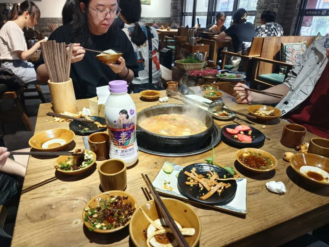下午2点,我们到达了预订酒店,漫长的行程使我们饥肠辘辘,在放好行李后,大家一致决定立即从酒店出发品尝贵阳特色美食——酸汤牛肉火锅。滚滚热气洗却了我们的疲惫与饥饿,酸与辣在舌尖交缠,折耳根的独特味道也令人印象深刻,难以忘怀。