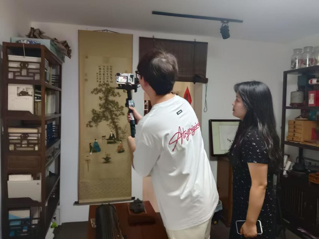 下午,我们转战芷秋琴房,专注补拍特写镜头。琴房里,刘艳老师依旧沉稳优雅,指尖在琴弦上轻轻拨动,每一个细节都值得被镜头记录。我们调整着设备,力求把古琴的纹理、老师弹琴时专注的神情,都完美呈现在画面里。拍摄间隙,我们还和刘艳老师一起拍了张合照,镜头里大家笑得格外灿烂,这也是我们和老师珍贵的回忆。