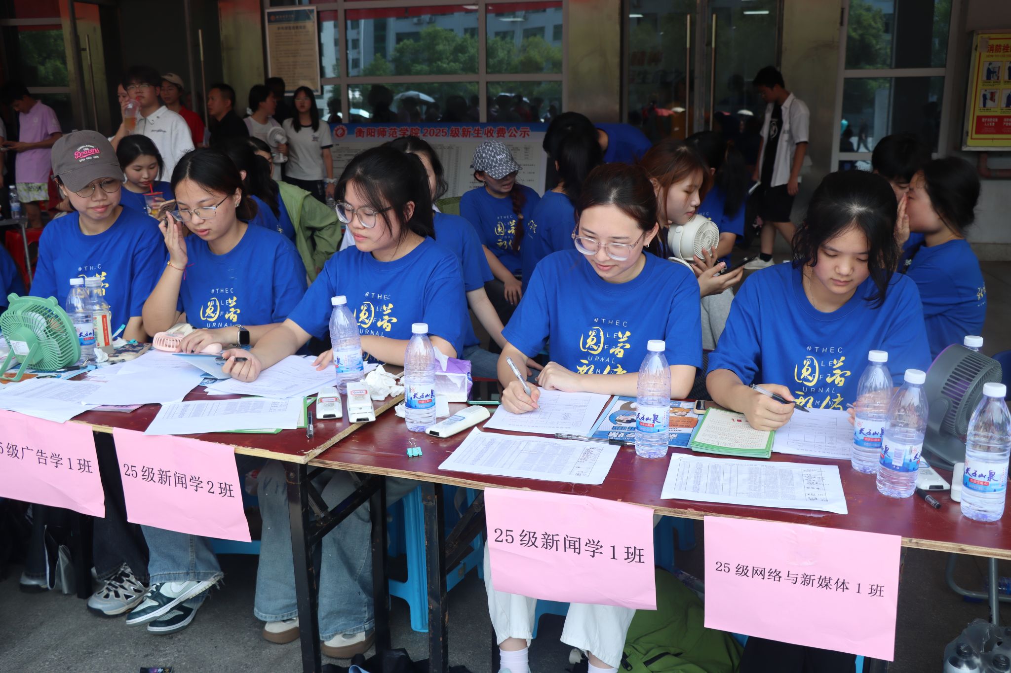 早上七点整,25级各班班助及迎新志愿者们已全部抵达体育中心迎新站点。搬运物资、摆放桌椅、分装新生材料……他们默契协作,有条不紊地投入于迎新的“战斗”中。