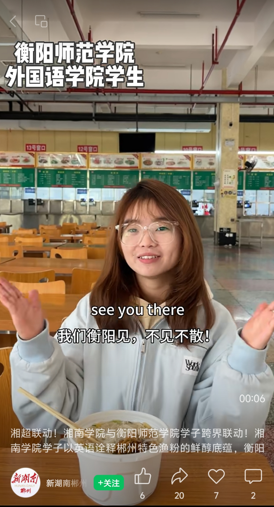 本次宣传还巧妙融入了地方美食文化与双语推广。从郴州鱼粉的鲜醇,到衡阳嗦螺的香辣,同学们运用中英双语生动介绍美食特色,并向观众发出“来看球、吃美食”的热情邀约。在传递赛事信息的同时,更借助体育热度推广了地方饮食文化,为两地文旅融合发展添砖加瓦。