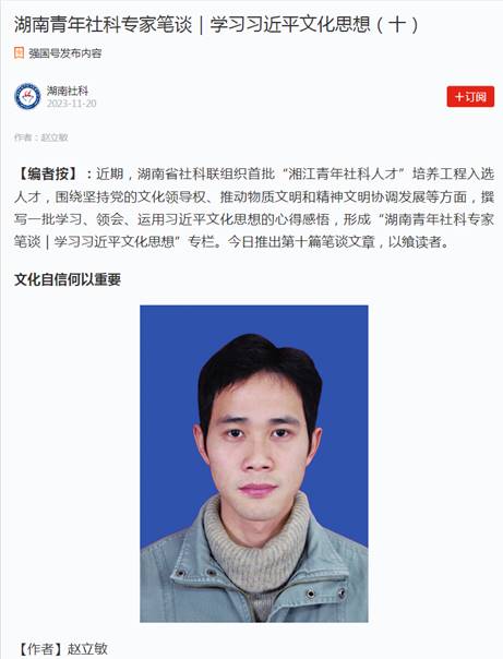 湖南省社科联组织首批20位“湘江青年社科人才”培养工程入选人才,围绕坚持党的文化领导权、推动物质文明和精神文明协调发展等方面,撰写一批理论评论文章,并编印成《学习习近平文化思想笔谈集》,“笔谈集”中的第十篇文章《文化自信何以重要》为赵立敏博士所撰写。该“笔谈集”成为了本次会议的学习资料。