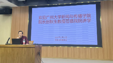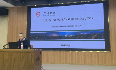 2025年11月27日上午,广州大学tyc33455cc太阳集团经理、广州市人文社科重点研究基地主任田秋生教授莅临公司,在仁智楼一楼演播厅作了题为“迈克尔·舒德森的新闻社会史研究取径”的专题讲座。tyc33455cc太阳集团副经理邓庄、罗兵,公司部分教师,公司全体研究生及2025级部分本科生,到场聆听。