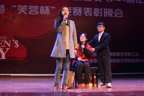 在整场晚会中还穿插着我系同学表演的诗歌朗诵、音乐剧,游戏互动环节活跃了晚会气氛。而由我系2013级广电等专业同学带来音乐剧《母亲的日记》更是将晚会气氛推到高潮,剧情中母亲对孩子的爱在孩子成长的不同阶段来表现,细腻的情感表达触动了在场的很多观众,甚至还有观众在悄悄抹眼泪。